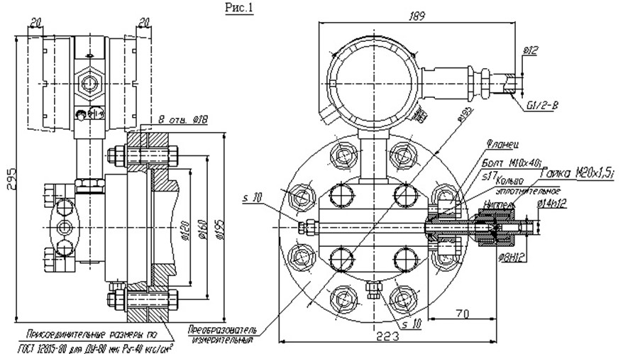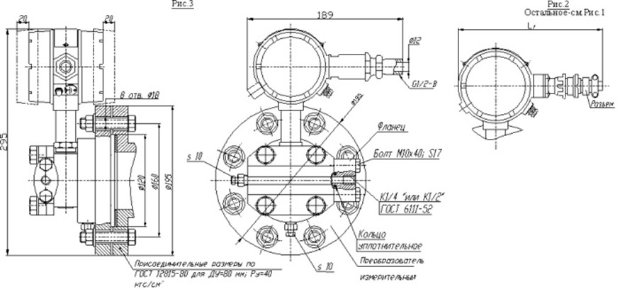 Габаритные и присоединительные размеры преобразователей гидростатического давления САПФИР 22 ДГ 2540, 2530, 2520 с установленным фланцем