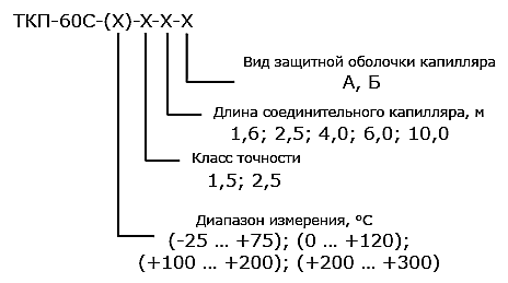 Термометр ТКП-60С с пределами измерения от 0 до +120 °С, классом точности 2,5, длиной соединительного капилляра 6 м с полиэтиленовой оболочкой: |